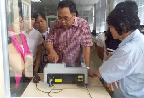會(huì)后,一行人來(lái)到我司檢驗(yàn)檢測(cè)室參觀,宋主任親自指導(dǎo)我司技術(shù)人員使用現(xiàn)時(shí)最新技術(shù)儀器——濁度儀,自動(dòng)進(jìn)行羽絨清潔度檢測(cè),對(duì)我司黃金羽絨的品質(zhì)給出高度的肯定。